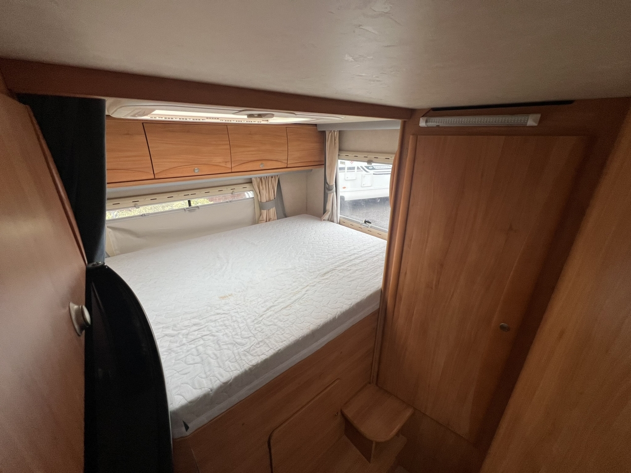 Built on a Renault Master chassis with the automatic gearbox, it offers a good balance of drivability and interior space at just over 7 meters in length. The layout features a rear fixed double bed above a spacious garage, a front lounge that converts into an additional bed, a fully equipped kitchen, and a separate bathroom with shower.