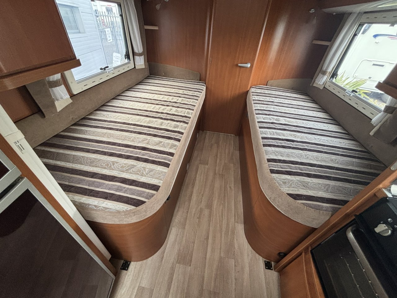 Step into the rear and you’ll walk through the clever kitchen area to find the twin bedroom.