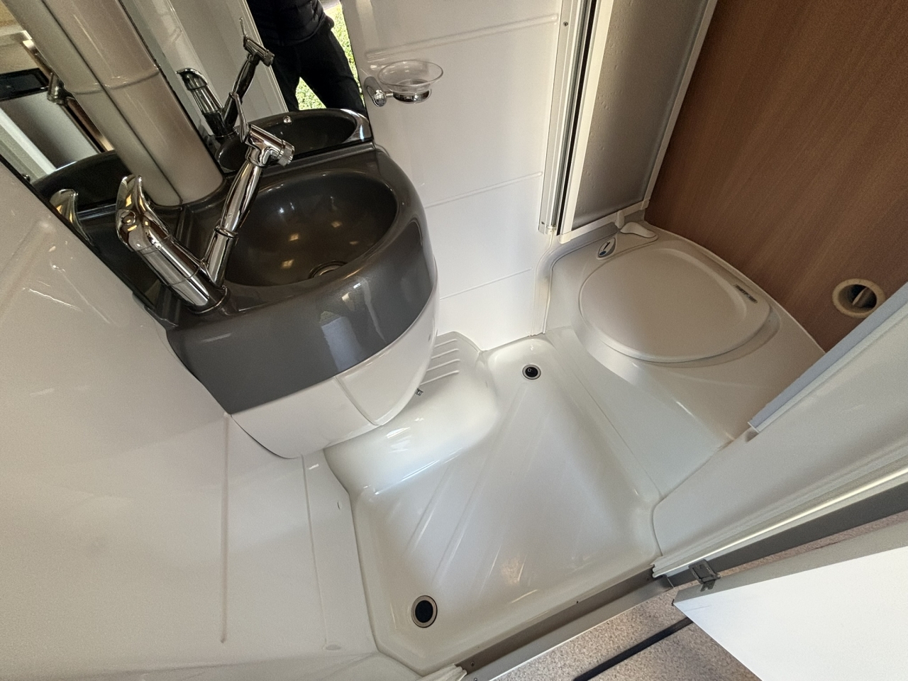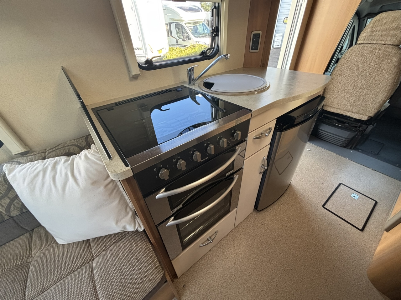 Inside this motorhome welcomes you with spacious rear lounge layout which converts easily into a large double bed, Fully equipped kitchen including oven, grill, hob, fridge/freezer, and ample storage Ensuring everyone is fueled for the next day of memory making and the all important compact washroom with shower allowing for easy off grid adventures.