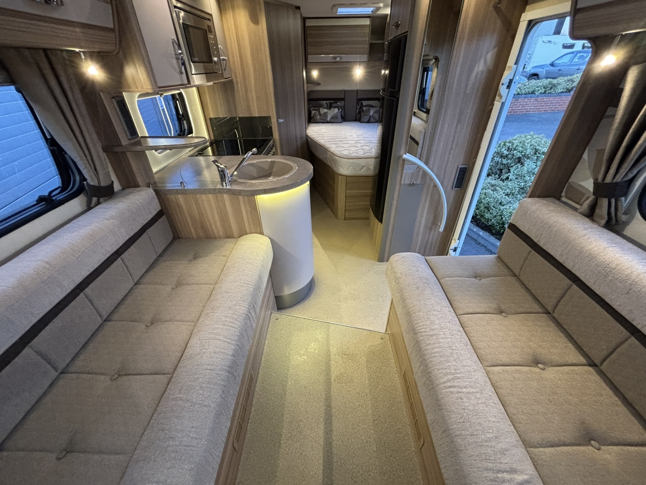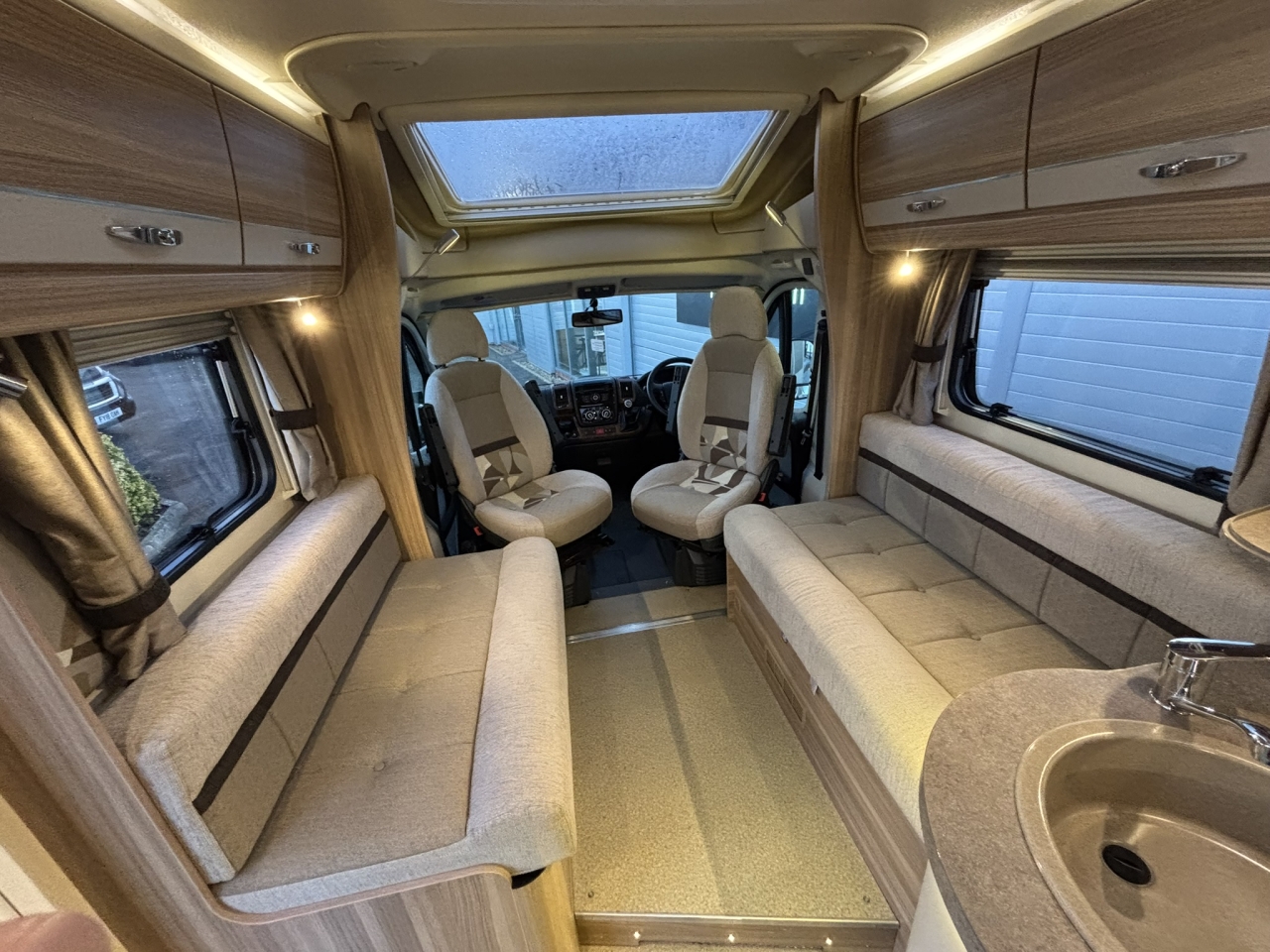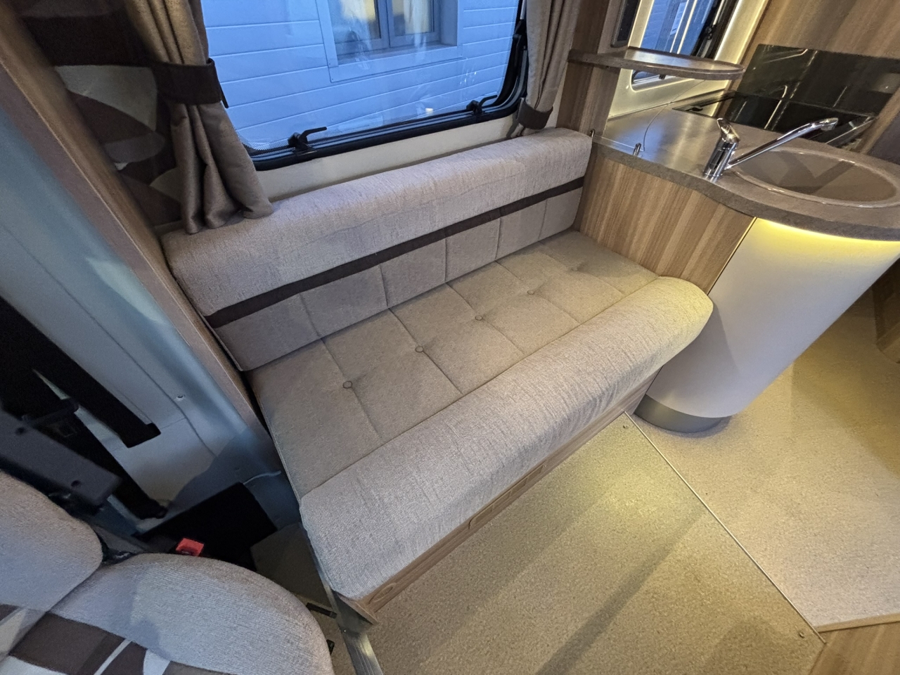This lovely motorhome is a favourite and it’s easy to see why with 4 comfortable berths made up from the fixed rear bed and converted lounge.