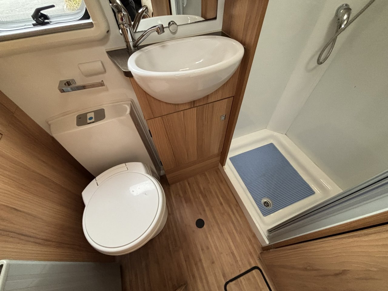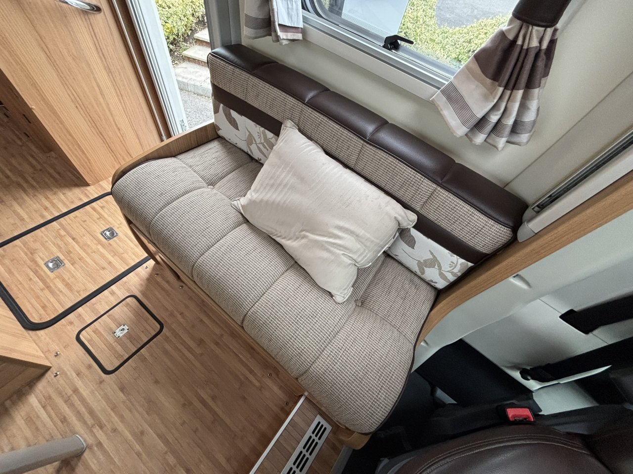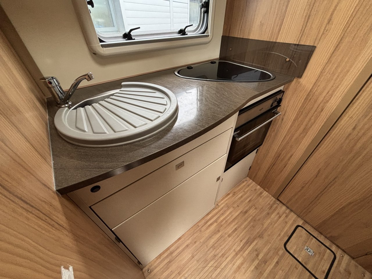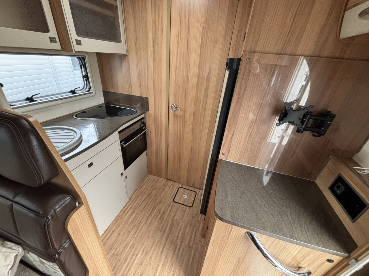 Inside you have a superb and very popular layout with it’s fixed drop down bed, end washroom with separate step in shower and fully equipped kitchen opposite.