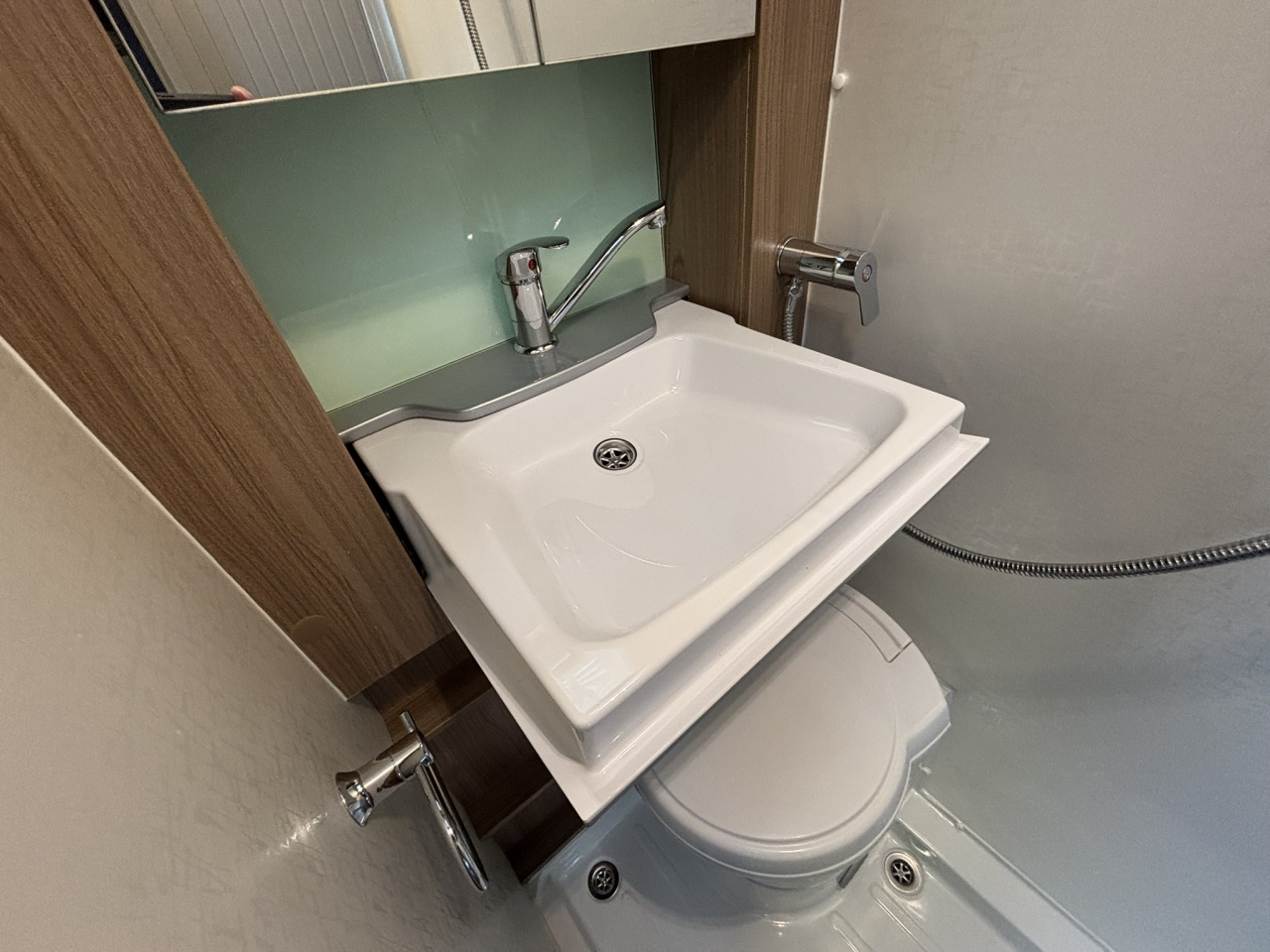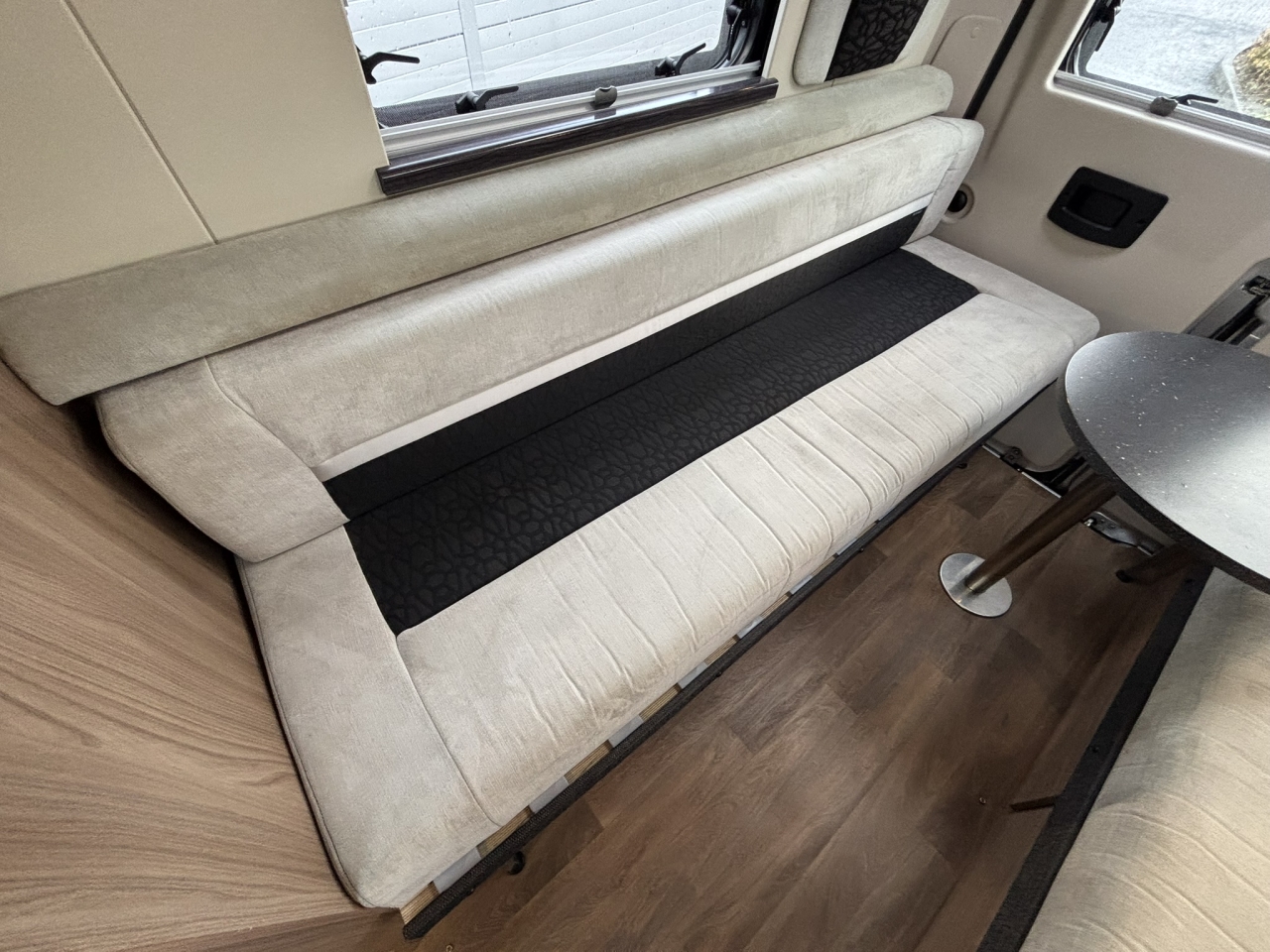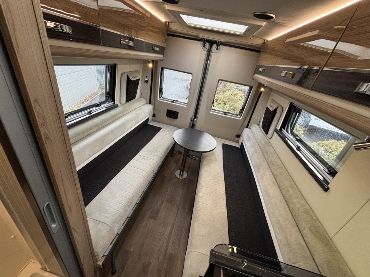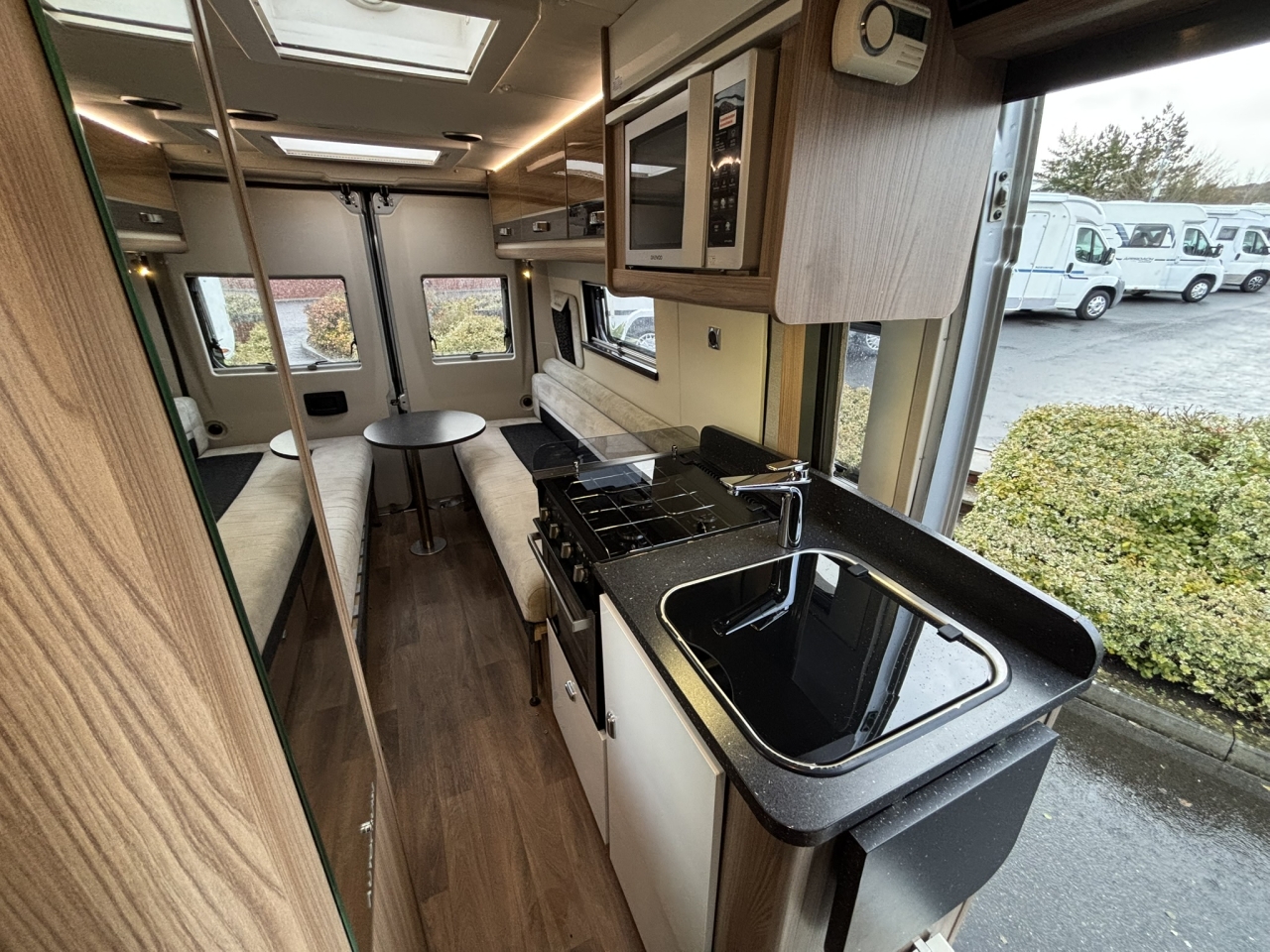 This lovely van conversion has plenty with it’s centre washroom and fully equipped kitchen whilst at the back the spacious lounge with 2 long bench seats which make into either a large double or 2x 6ft singles.