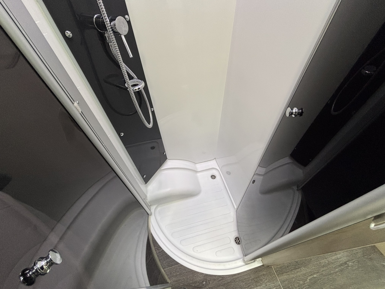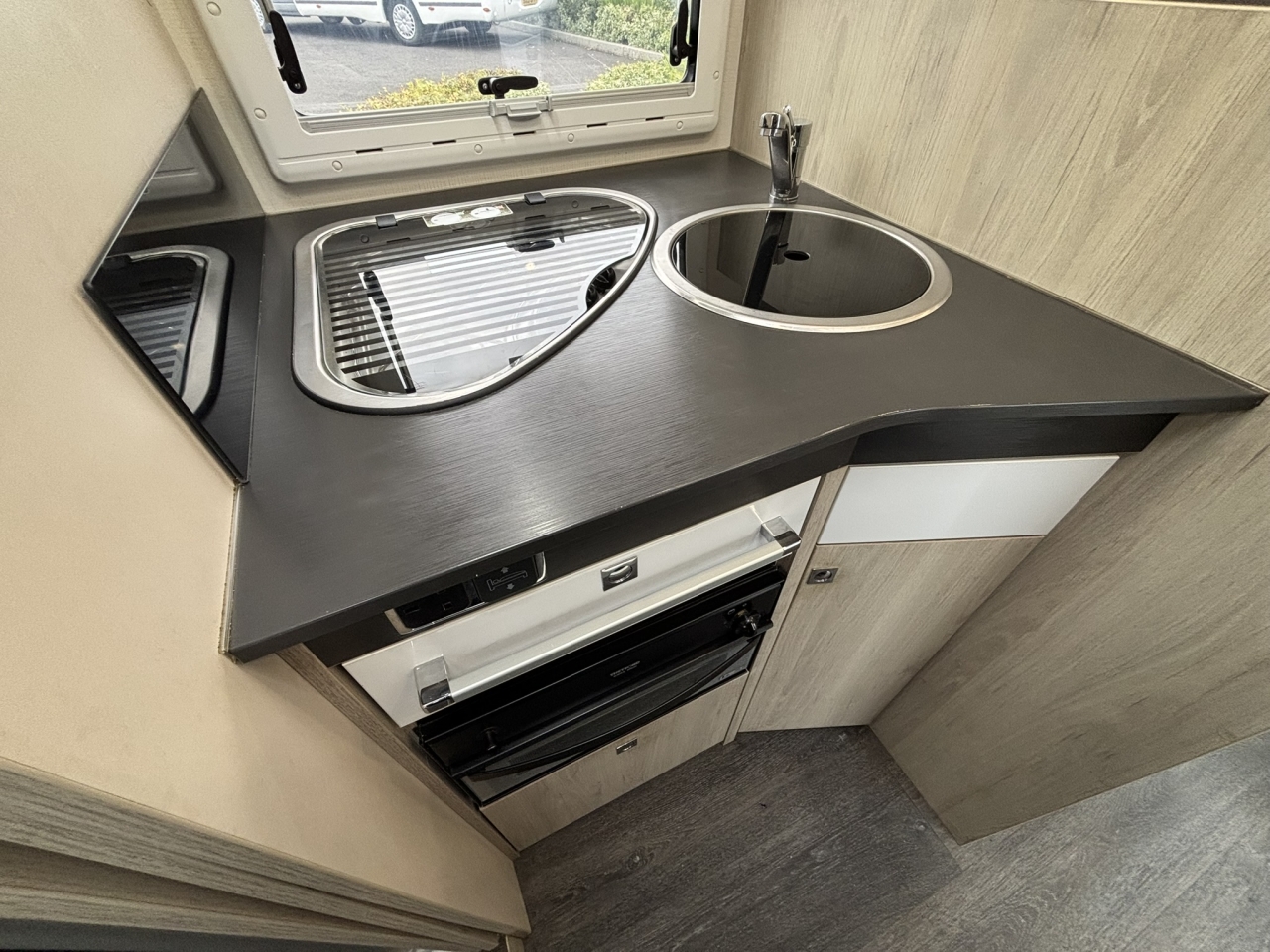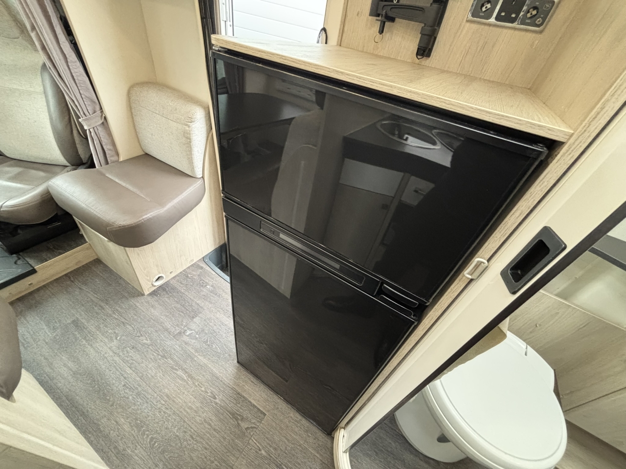 The Key aspects of this model are the Separate Shower & Toilet: Enjoy the comfort of a full washroom with privacy and convenience. A fully equipped kitchen containing large fridge-freezer, oven, hob, and sink—ready for gourmet meals on the go. Most importantly a fixed rear double bed and an electric drop-down bed—ideal for couples or small families.