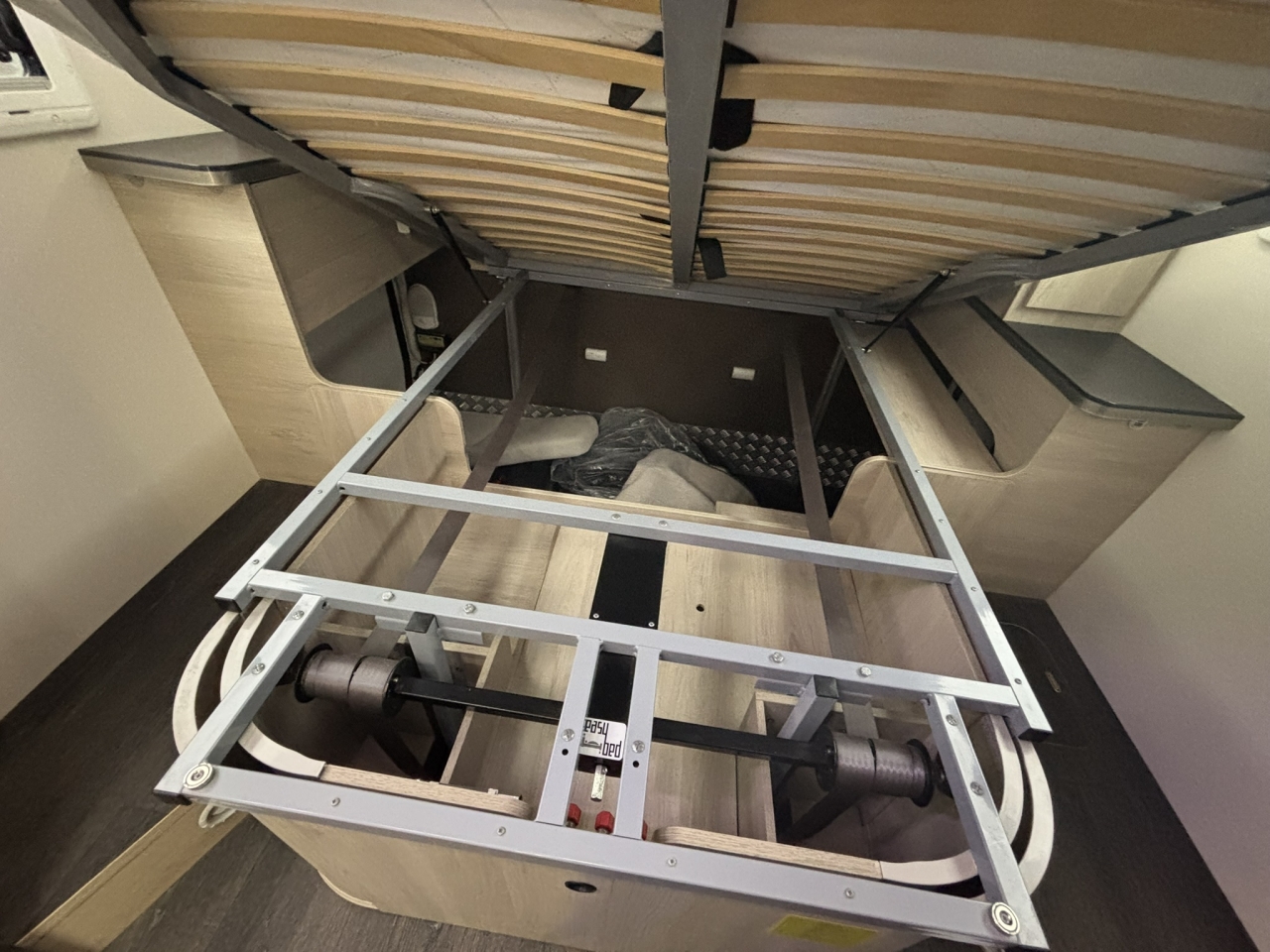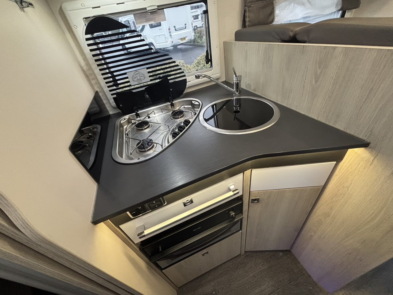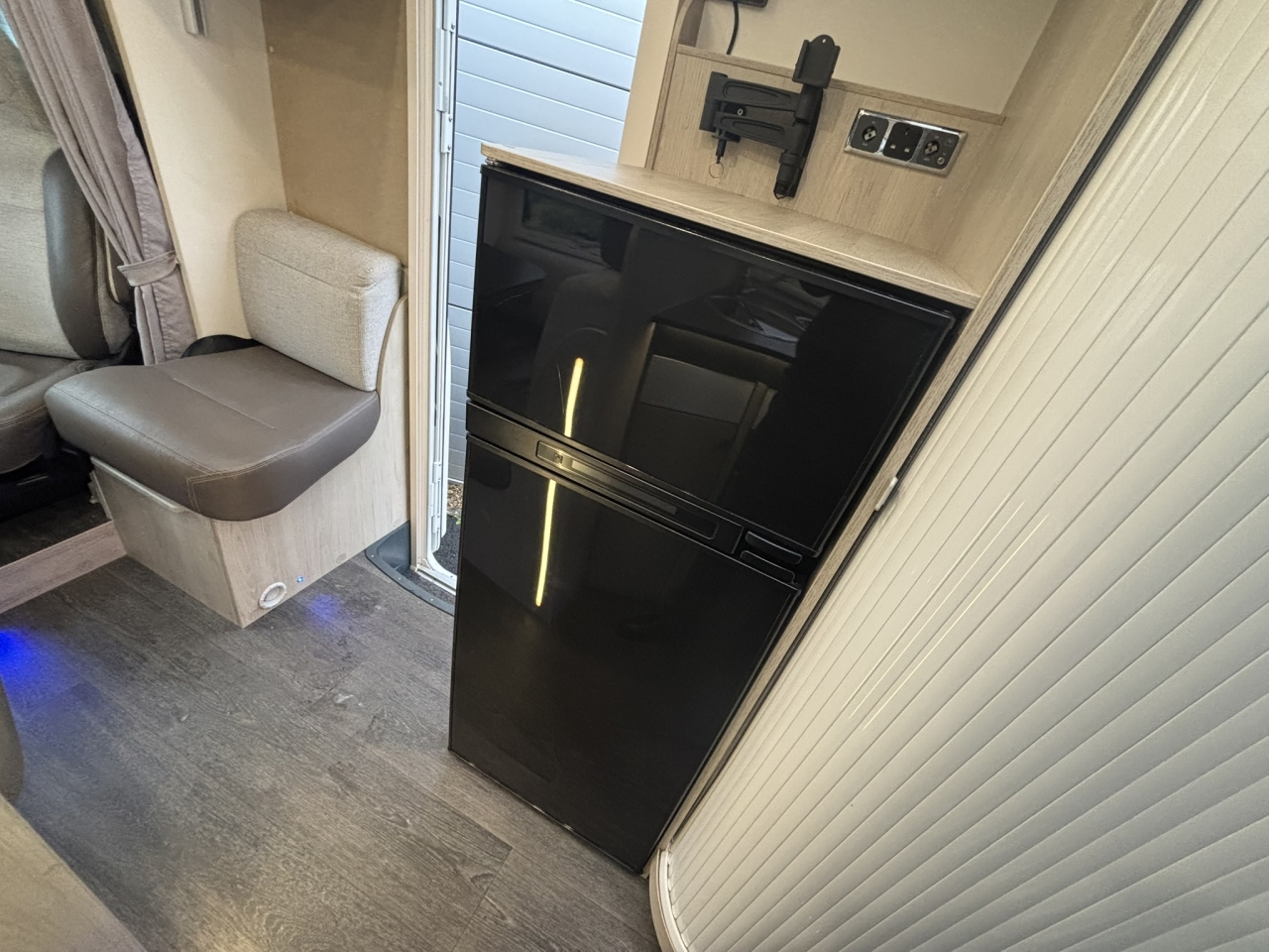 The Key aspects of this model are the Separate Shower & Toilet: Enjoy the comfort of a full washroom with privacy and convenience. A fully equipped kitchen containing large fridge-freezer, oven, hob, and sink—ready for gourmet meals on the go. Most importantly a fixed rear double bed and an electric drop-down bed—ideal for couples or small families.