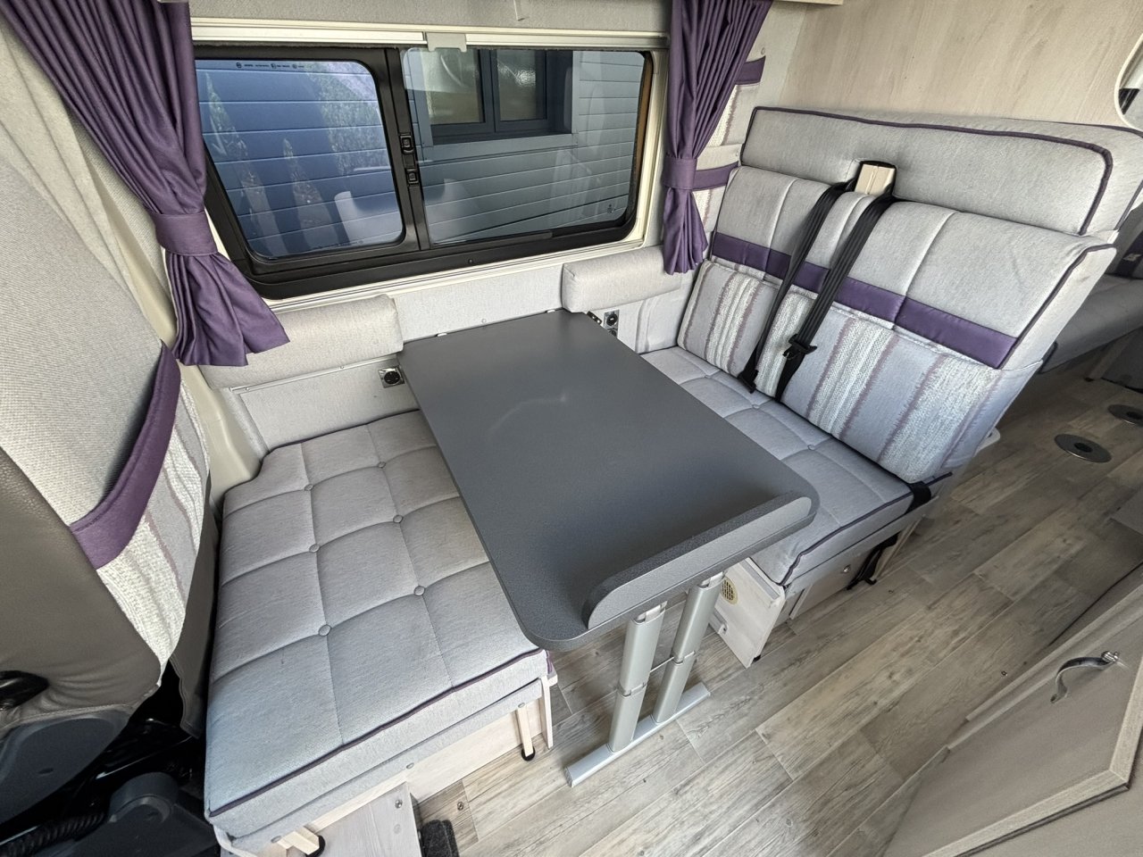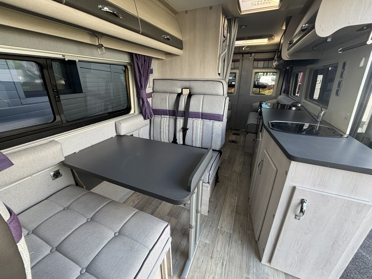 This great van conversion packs plenty in it’s 6.36 metres with a spacious rear lounge, separate dining area with extra travelling belts, a decent and fully equipped kitchen and the washroom opposite.