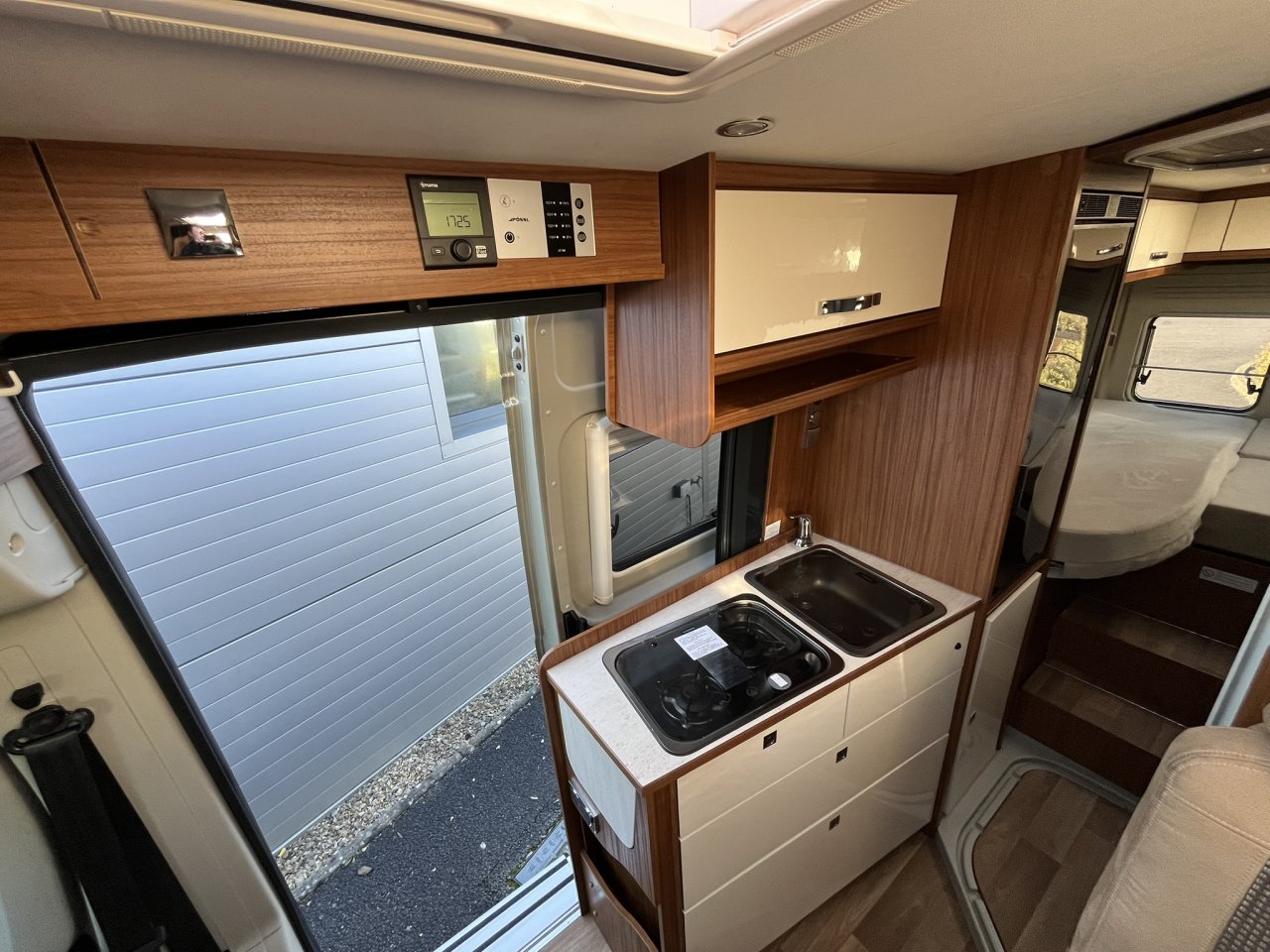 Inside, the van feels modern and functional without being fussy. The lounge area is bright and inviting, with seating for four and a layout that works well whether you’re relaxing, dining, or planning the next part of your journey. The well‑appointed kitchen includes everything you need for easy cooking on the move, including a practical two‑burner hob and a generously sized 90‑litre fridge — ideal for keeping meals and ingredients fresh during extended touring.